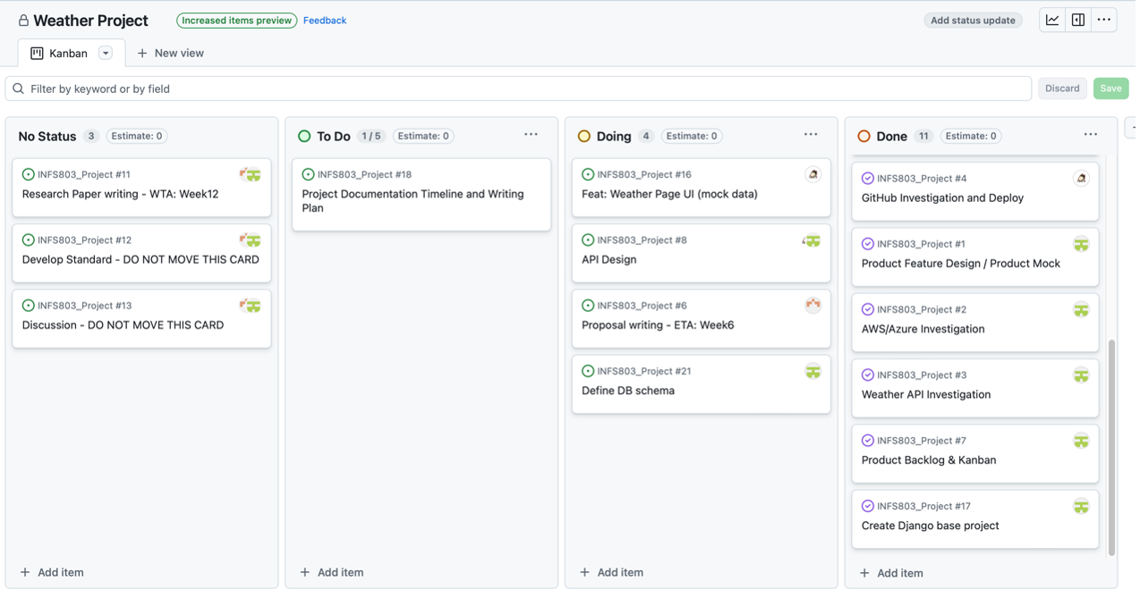 To manage tasks more effectively, I preferred using the agile methodology. So, I created a Kanban board on GitHub. Our team members could create a card for each task and move it across different swimlanes to show the current status. Using the Kanban board was very important for us because we often worked asynchronously, as everyone was busy with academic responsibilities.