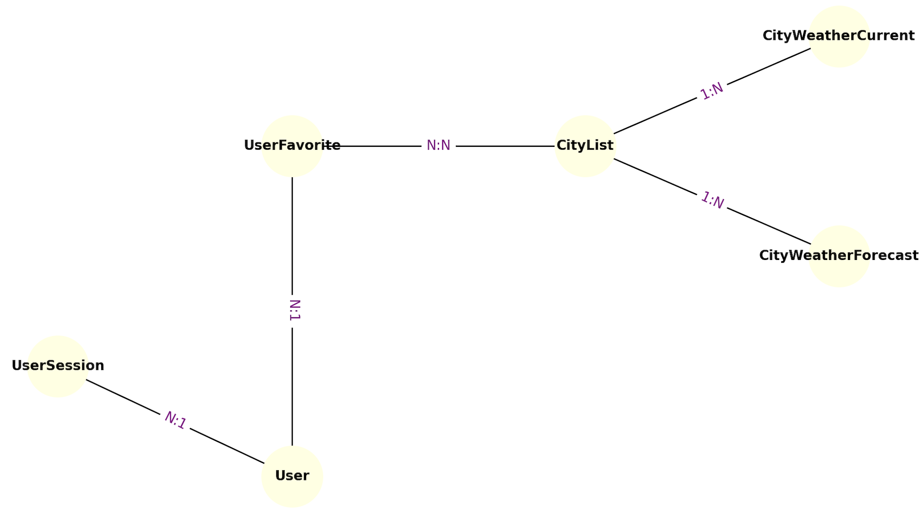 - User: Stores registered user information. Fields include user ID, password hash, avatar ID, email, favorite cities, user sessions, etc.