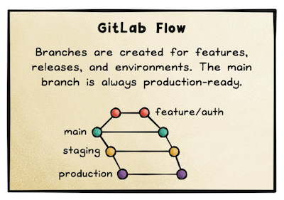 GitLab Flow is a hybrid approach that combines feature branching and environment-based flows. It supports both simple and complex workflows, letting teams choose between environment branches (like staging, production) or integrating directly from features to production, depending on the team’s needs.